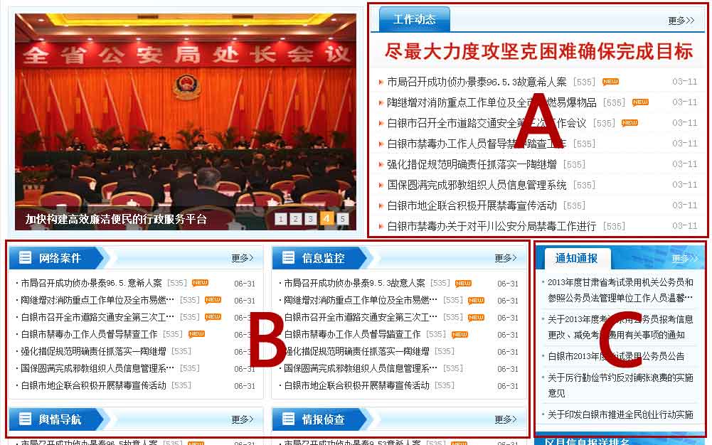 拿一个项目的效果图作说明,大部分节点型子站的首页布局倾向于文章首页,如下图A、B、C三个区,A和C都是一个不固定的栏目,B则是子站的一级栏目。这里B就用循环子栏目即可,只需注意一点就是A和C的也是子站的子栏目,肯定很多客户是不希望看到栏目一样的栏目在同一页面出现两次,所以这里要提示客户,可以用系统的功能,设置"对应节点 - 前台样式" 下的 "是否在父栏目的分类列表处显示",就可以调节这里的栏目显示符合要求。