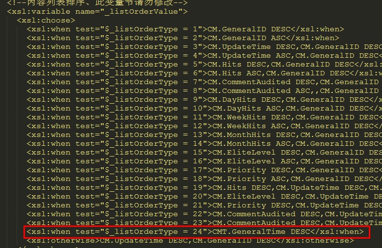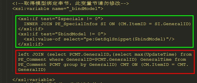 打标签,找到上面的"_bindModel",在绿色的代码下面插入红色部分的代码( left JOIN (select PCMT.GeneralID,(select max(UpdateTime) from PE_Comment where GeneralID=PCMT.GeneralID) GeneralTime from PE_Comment PCMT group by GeneralID) CMT ON (CM.ItemID = CMT.GeneralID) )