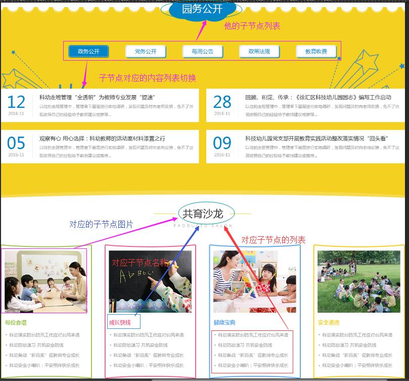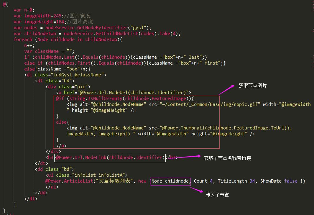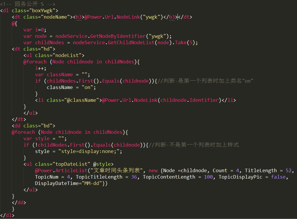 从上图可以看出一个页面中有两个子栏目循环出来的信息!在以往旧系统中,这些子节点都是写死的比较常见!在新系统中就可以灵活的在页面中通过一些视图标签语法循环出对应所需的子栏目信息,而不需要增加新的视图标签!下面就看看对应实现的代码吧!