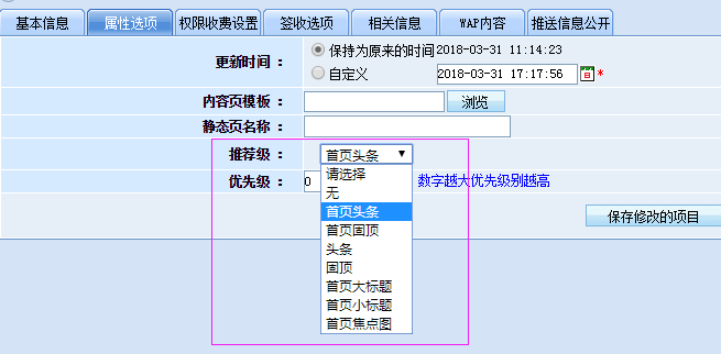 实际项目中,客户往往需要把某些特定的内容在首页展示出来!而首页经常会有几种特殊的情况,比如焦点图轮播新闻、头条大标题新闻、头条小标题新闻等等,如果应用系统默认按推荐级数字大小排序往往会让客户摸不清楚方向!因此将推荐级改为有意义的文字选项很有必要!如下图形式: