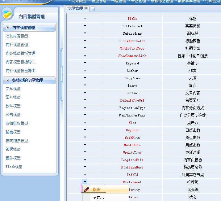 操作路径: 系统设置 >> 模型管理 >> 字段管理 >>找到对应模型 >> 修改字段