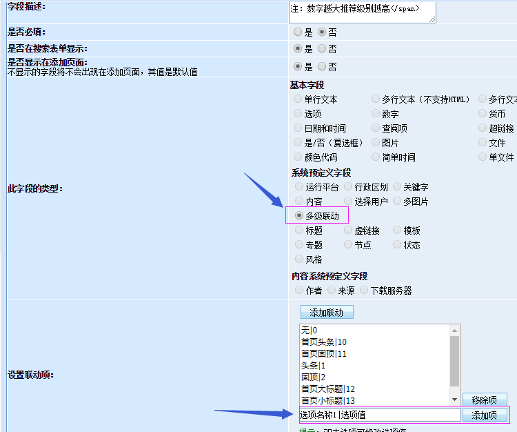 将该字段改为“多级联动”。然后在下面添加联动项,格式为:描述名称|数字