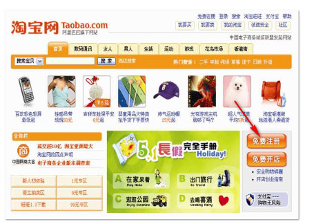 拿淘宝网首页举例,下图红色圈圈是其2005年首页的注册按钮: