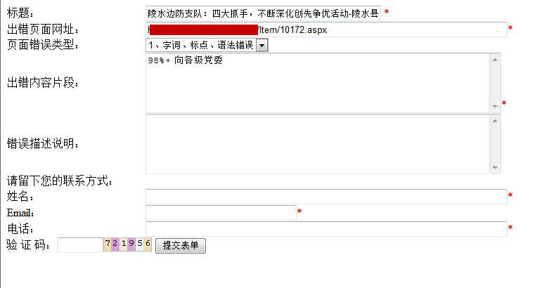 这样就可以达到前台选中错误内容然后同时按下“CTRL”与“ENTER”键弹出纠错表单的效果,并且错误位置,错误地址,可以自动获取到表单里,无需手动添加,效果如下: