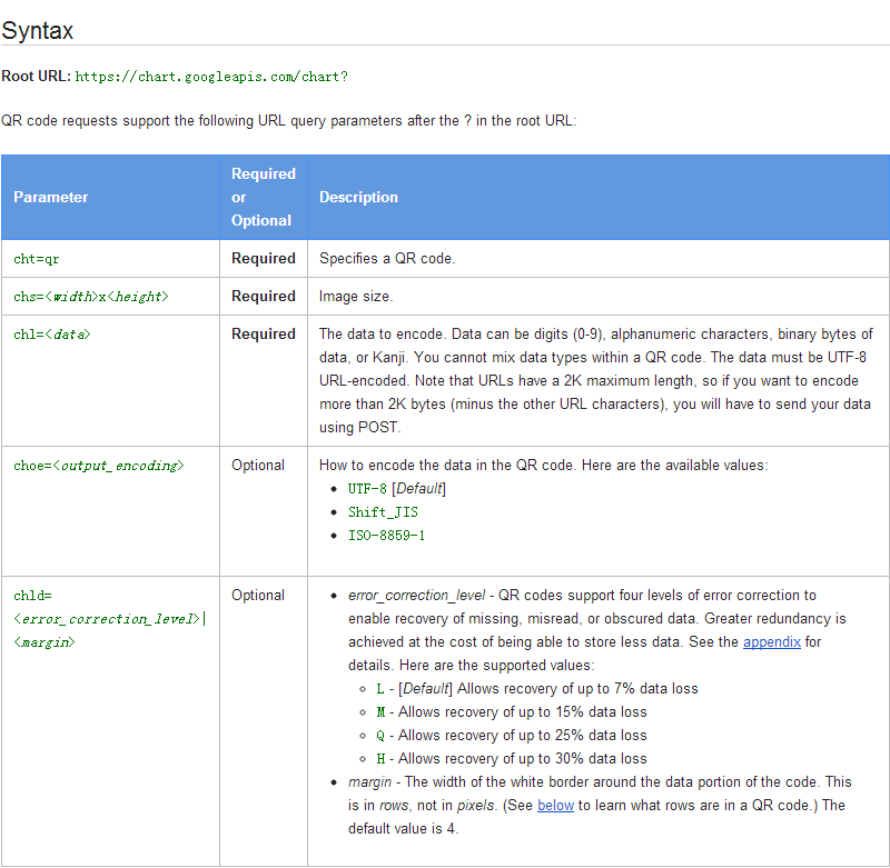 &chld=L|4 L代表默认纠错水平 ; 4代表二维码边界空白大小。纠错级别分为L、M、Q、H;