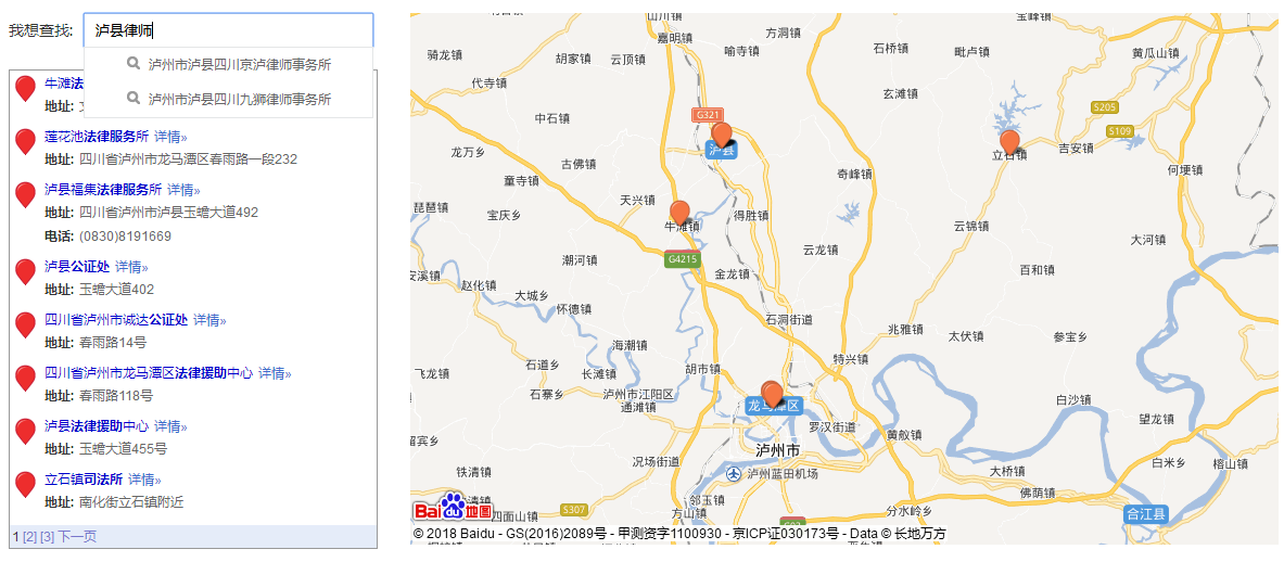 最近做项目中,有使用到百度地图,今天就来简单讲讲百度地图是如何调用到我们的网站中的。客户给的参考网站中,实现的效果是左侧要有当地相关机构列表(律师事务所,公证处等)、还有搜索功能,右侧是百度地图。根据左侧的点击的结果,在地图上显示。查找百度地图示例效果没有一样的,只能参考做一个相似的,下面说一下具体流程。