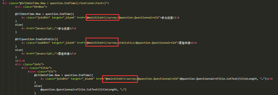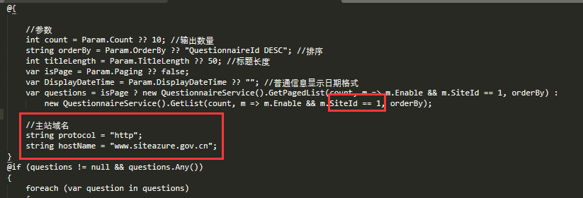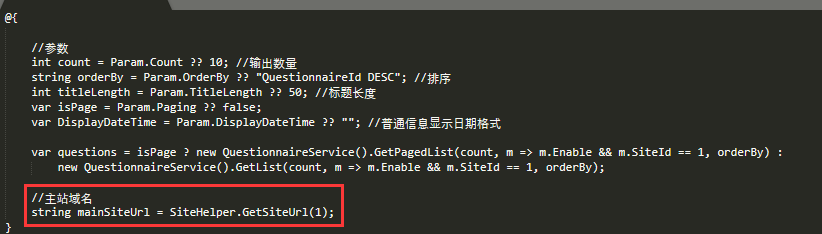 指定站点ID没什么问题,但是域名地址是有可能变化的,如果更改了主站域名地址,有可能因为忘记更改标签中的域名地址而出现报错,给后期维护留下了隐患。于是设想动态读取主站域名地址,然后把问卷调查的链接也固定到主站的问卷地址下。代码添加如下:
