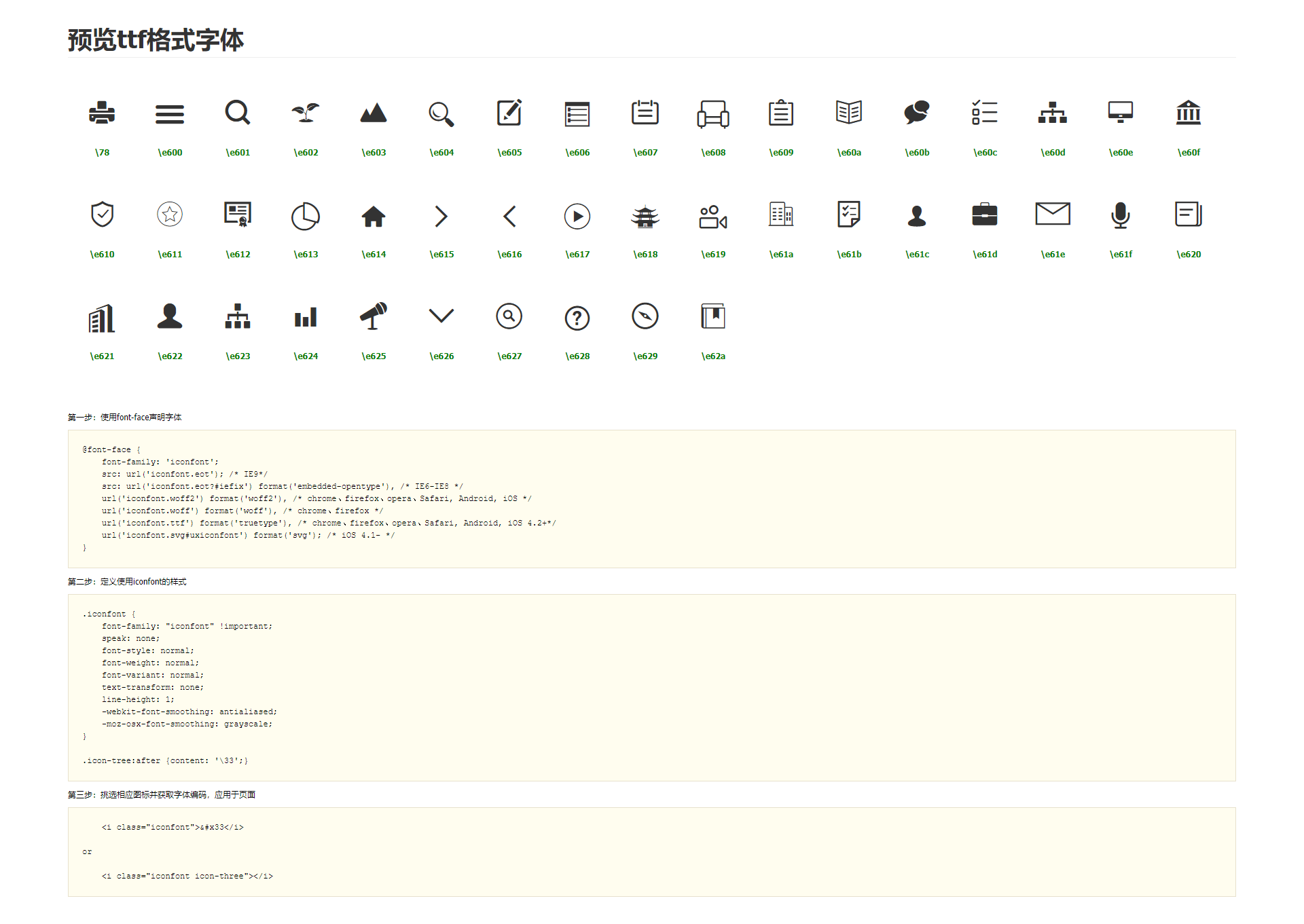 如图所示打开之后 就能看到图标了,对应的图标下面有编码,我们可以通过CSS样式引用字体图标。