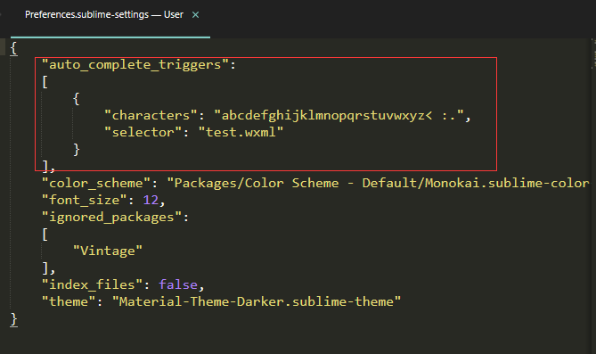 "auto_complete_triggers":[{"characters": "abcdefghijklmnopqrstuvwxyz< :.","selector": "test.wxml"}],