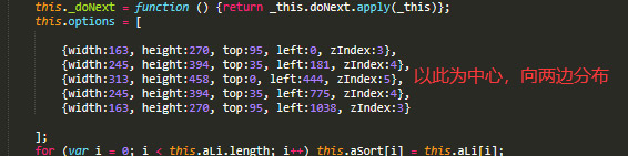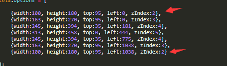 需要控制的参数主要是这一段。width、height是展示图片的宽高。 top、left 是图片的坐标值,zIndex 值是优先级,最中间的值是图片最大的一张,从最中间往两边对称递减(实现小图是从图后面轮转出来),以5张循环为例,如下图。
