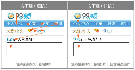 对非触屏手机,在不影响功能交互的前提下,应尽量减少按键做功。不同的浏览器,通过五向键操纵焦点的跳转方式是有差异的。