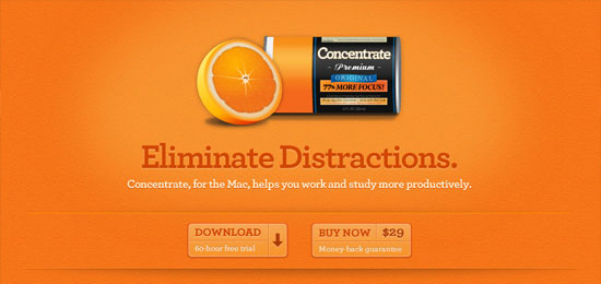 真正的细节应用在像素级。我们再来看Concentrate的快捷按钮周围,靠近网页布局顶端的部分。首先,按钮背后的阴影将页面上的这部分突出出来。该区域顶端和底部的两个简单的单像素线是一个简洁的设计方式,它使得这个区域在视觉效果上更明显的区别于页面上的其他元素。