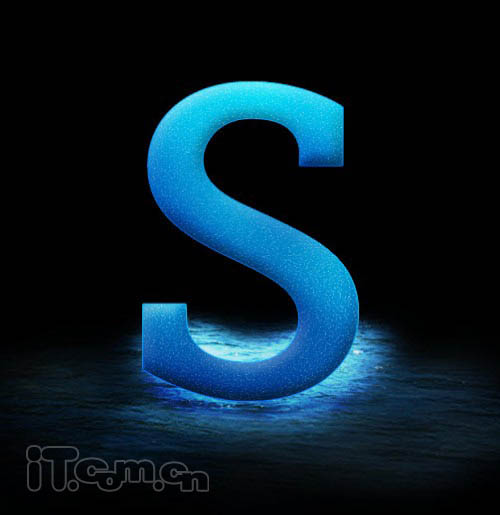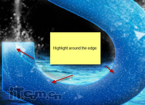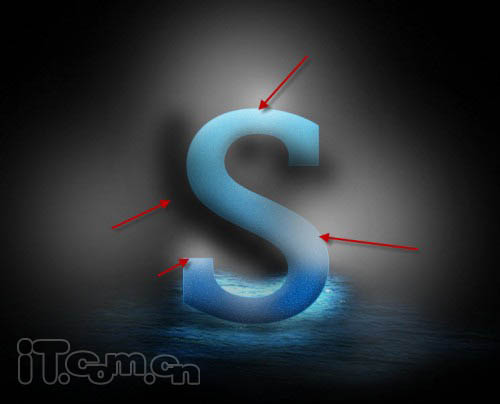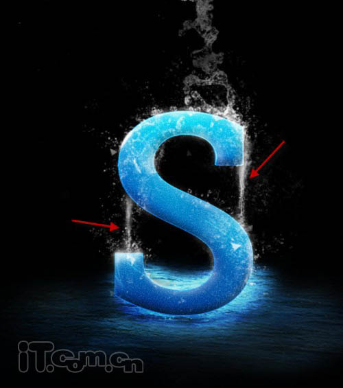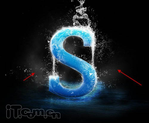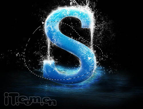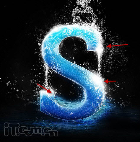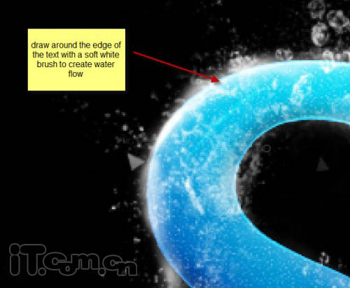 | 18、你还可以使用柔角的白色画笔在字母的边沿绘画出水流冲击的效果,如图所示。 |