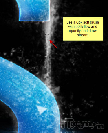 | 16、制作水流效果,我们可以使用6px大小、50%不透明度和流量的白色画笔和水溅画笔制作,如图所示。 |