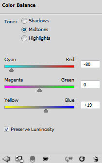 | 29、添加一个色彩平衡调整图层(单击图层下面的“创建新的填充或调整图层”按钮,选择色彩平衡),补充一点蓝色的光线。 |
