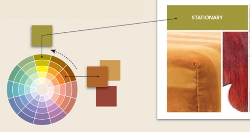 在这个例子中,椅子上的所有颜色几乎都是暧色调,为了使整个设计具有暧色调的感觉,我们可以采用一种相近色来作为搭配。两种相近色具有同一种基色,具体在这个例子中,我们从上图的色轮可以看出,棕色与草绿色都包含了黄色这种基色。这种拥有同一种基色的颜色总是能够形成良好搭配效果。