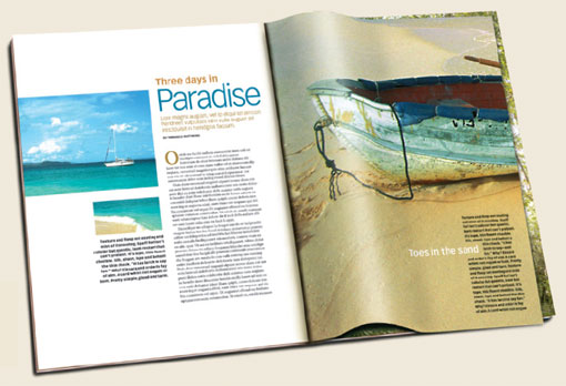 在版面设计过程中,你可能会有很多地方都需要用到图片,也许你花费比设计创作需要的多得多的时间来寻找图片,有没有简单的方法呢?在下面,我们用两个实例来说明如何解决这个问题,我们只用一张图片,通过分割剪切,就可以将这张图片用在不同的地方,出来的效果同样非常漂亮。一张图片解决一个版面甚至多个版面,其实也是足够的!要将你买回来的图片物尽其用,通过有创意的做法从原图中得到几个小图,来配合你的版面设计。