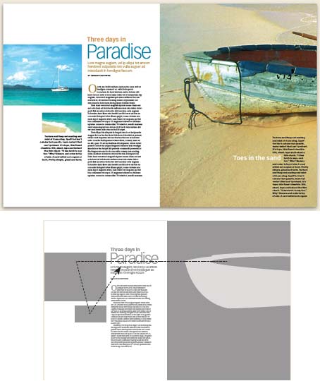 我们只截取小船的船头部分,这部分只占原来的大图很小的位置,还不到十分之一。但我们却将它作为版面的大图,这样,它给人的尺寸感觉就完全改变了,现在,它成为了一个有趣的视觉焦点。上图中,三张图片的尺寸都不一样,右边的特别大,左下的图片特别小,这种不同尺寸的图片可以让我们的整个版面产生层次感。而读者的眼睛就会从右的到左(上图下的线条表示了读者在观看时的视觉线路)。
