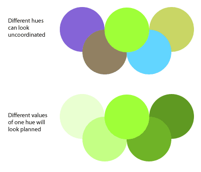 不协调的色相可以很容易的K掉一个配色方案.一个设计可以用一种色相的上百种不同深浅的颜色,从蜡笔到霓虹灯,看上去仍然是有条理的.但是如果色相使用错误的方式混合在一起,整个配色方案就会混乱了.