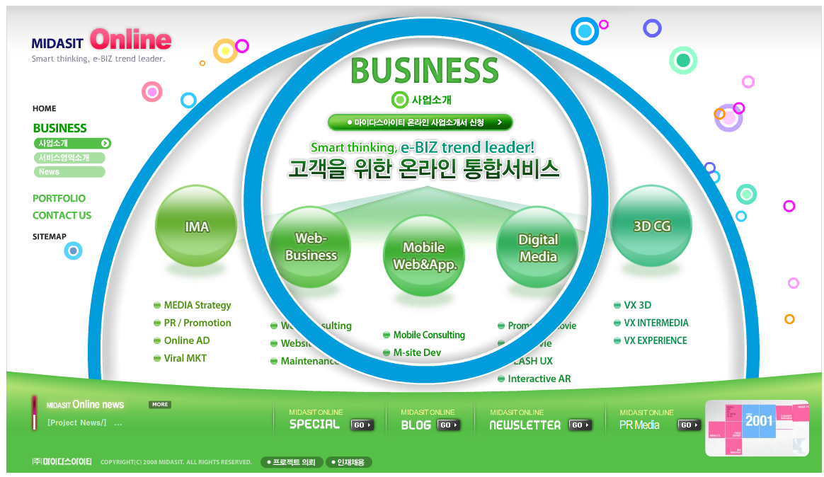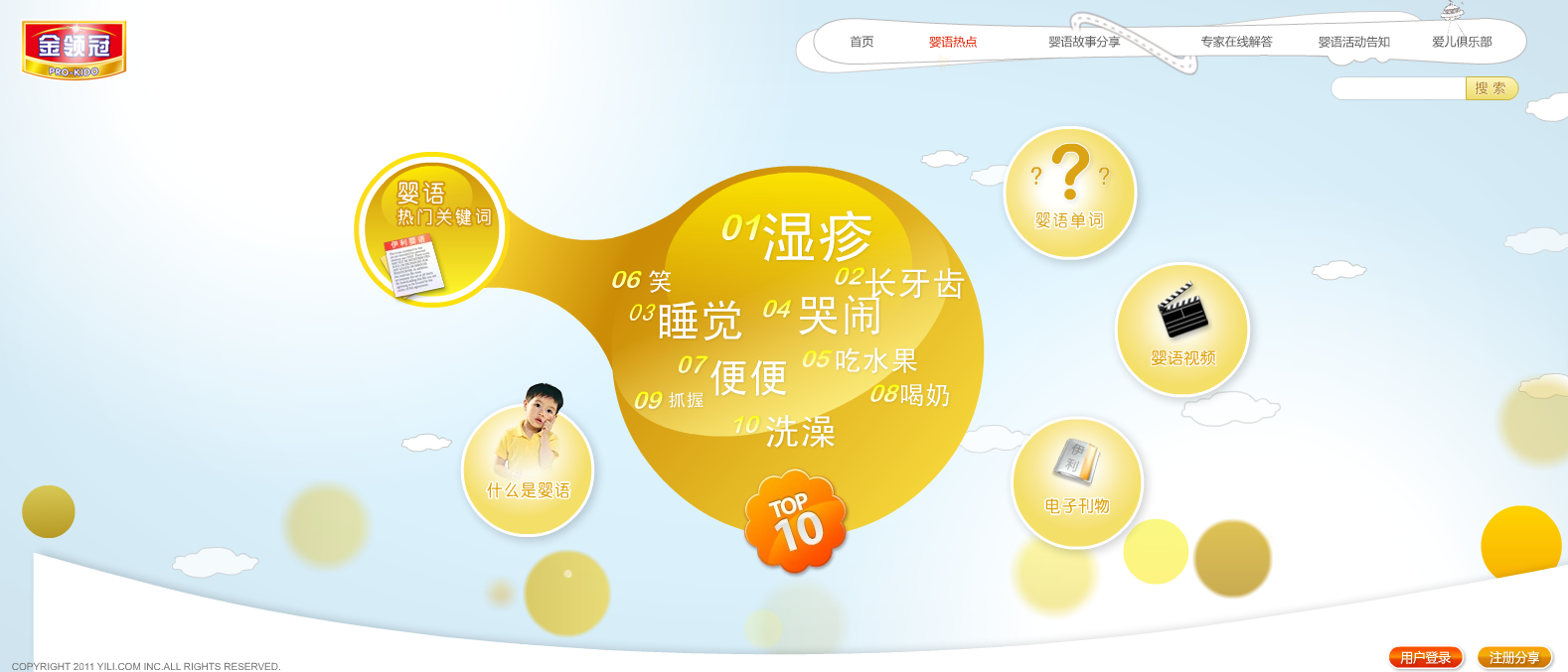 相对于直线格局,曲线格局更为复杂一些。它的创造性更强,更能给画面带来张力和流动感。如(图五)的网站页面,以大量的圆为元素充斥着画面,配上橙黄和橘红,就可以创造出时尚、动感、活泼的视觉心理,这是直线格局所无法实现的。