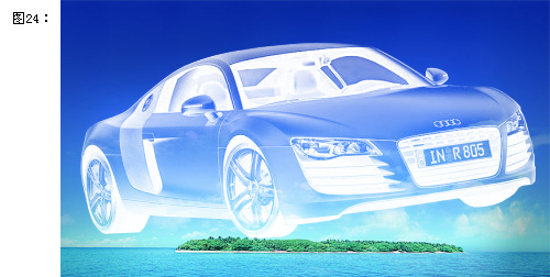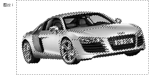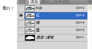 打开始图18的一张车图,用选择工具钩画出车的轮格,如图19,利用蒙板把车钩出来,如图20,选择通道选卡如图21,按住ctrl键点击红色通道,如图22,给图片加上一层背景如图23,给背景图层加上蒙层效果,现在我们就得到了用车图层来做蒙层的效果,如图24所以。