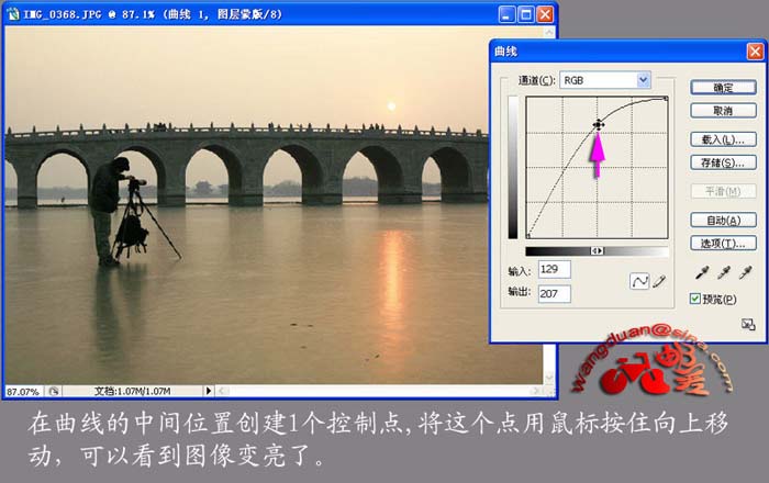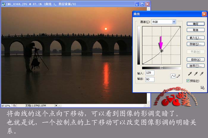 | 3、将曲线的这个点向下移动,可以看到图像的影调变暗了,也就是说,一个控制点上下移动可以改变图像影调的明暗关系。 |