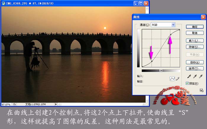 5、在曲线上创建2个控制点,将这2个点上下拉开,使曲线呈“S”形,这样就提高了图像的反差,这种用法是最常见的。