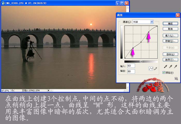 | 6、在曲线上创建3个控制点,中间的点不动,将两边的两个点稍稍向上提一点,曲线呈“M”形,这样的曲线主要用来在家图像中暗部的层次,尤其适合大面积暗调为主的图像。 |