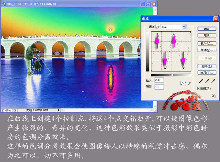7、在曲线上创建4个控制点,将这4个点交错拉开,可以使图像色彩产生强烈的、奇异的变化,这种色彩效果类似于摄影中彩色暗房的色调分离效果,这样的色调分离效果会使图像给人以特殊的视觉冲击感,偶尔为这可以,切不可多用。