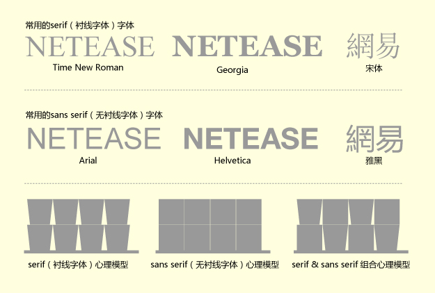 从心理模型可以看出,常规的组合排列中,无衬线字体比衬线字体的常规组合性更好一些,但处理的不好反而会呆板。