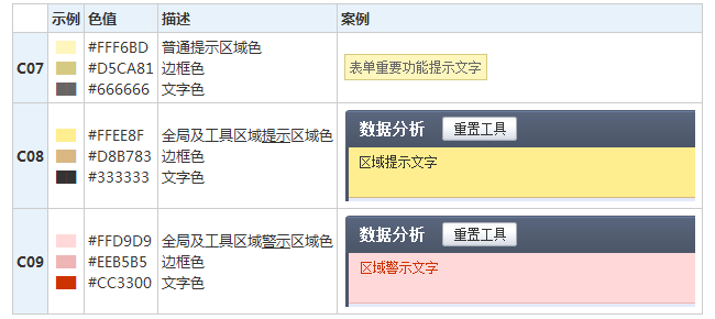 警示色:我们定义了两级警示色,一类属于警告或出错,另一类属于警示,需要关注和修正