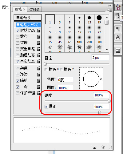 选择画笔工具,把画笔的大小调为2,颜色调为白色,按F5打开画笔设置面板,设置硬度为100%,间距为400%(如图7)。