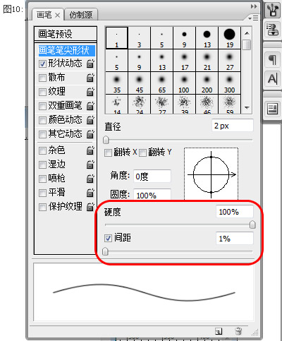 新建一个图层,选择画笔工具,把画笔的大小调为2,颜色调为白色,按F5打开画笔设置面板,设置硬度为100%,间距为0%(如图10)。选择路径画板,点击右边的小三角形,从弹出的下拉菜单(图8)中选择“描边路径”,这样我们就画出了一条实线(图11)。