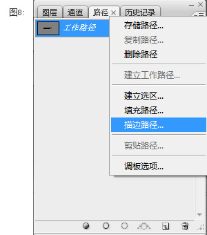 选择路径画板,点击右边的小三角形,从弹出的下拉菜单(图8)中选择“描边路径”。现在所得到的虚线如图9中的上图,如觉得不够清晰,可以把虚线层多复制几层,复制4层后,得到图9中的下图。
