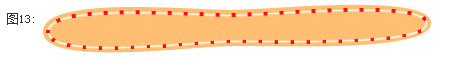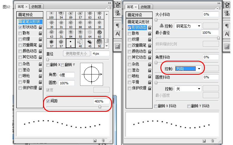 新建一个图层,选择画笔工具,选择刚才新建名称为“4px”的画笔,颜色调为红色,按F5打开画笔设置面板,设置间距为400%,“画笔动态”中的“角度抖动”控制方式为“方向”(如图12)。然后再“描边路径”,我们就要实线的上面一层画了一条点很粗的虚线。如图13。