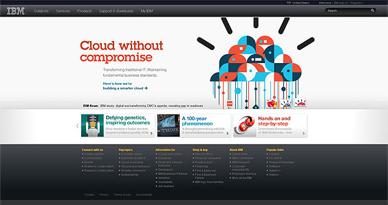 简约的页面风格容易受到用户的喜欢,而且能给用户带来一定的安全感。拿IBM这个来说,页面给人的第一感觉是专业和安全。焦点图构成也比较简单,左侧醒目的标语用了简单的渐变,右侧也运用了简单的几何图形。下面几个例子也是如此,还有一些没有列举出来的,比如大家很熟悉的apple官网。