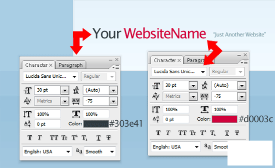 11 使用横排文字工具添加网站的标题和口号. 设置参照下图.