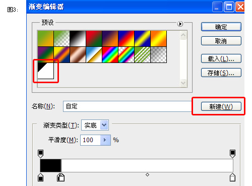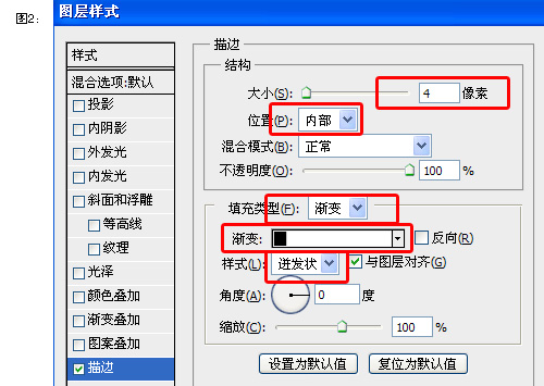 2、加描边,在描边对话框中,如图2所示,把大小改为“4”,把位置改为“内部”,把填充类型改为“渐变”,把样式改为“进发状”,把渐变调为图3所示,确定之后,就在图片本层中加上了边。因为这个素边样式我们经常用到,所以可以把它加到预设中,操作方法,如图3中按“新建”,这样以后用到就方便多了。