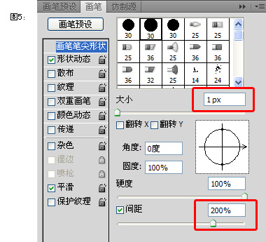 1、新建一个图层,选择铅笔工具,打开画笔窗口(F5),如图5把间距调为200%(跟据需要调整,要超过100%才是虚线),把大小分别调为1px,2px,3px。在画布上分别画出三条虚线(画时按住shift键可轻松画出直线)。如图6