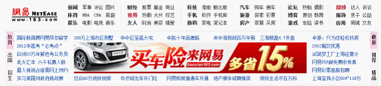 网易官网的首页,在头部的这里,“买车险”“多省15%” 我们不得不说这个广告在是最吸引眼球的,所以说他的目的达到了,在视觉上它起到了主要作用。引导浏览者对他的关注;标题在整个版面上,处于最醒目的位置,配合插图造型的需要,运用视觉引导,使浏览者的视线从标题自然地向插图、正文转移。