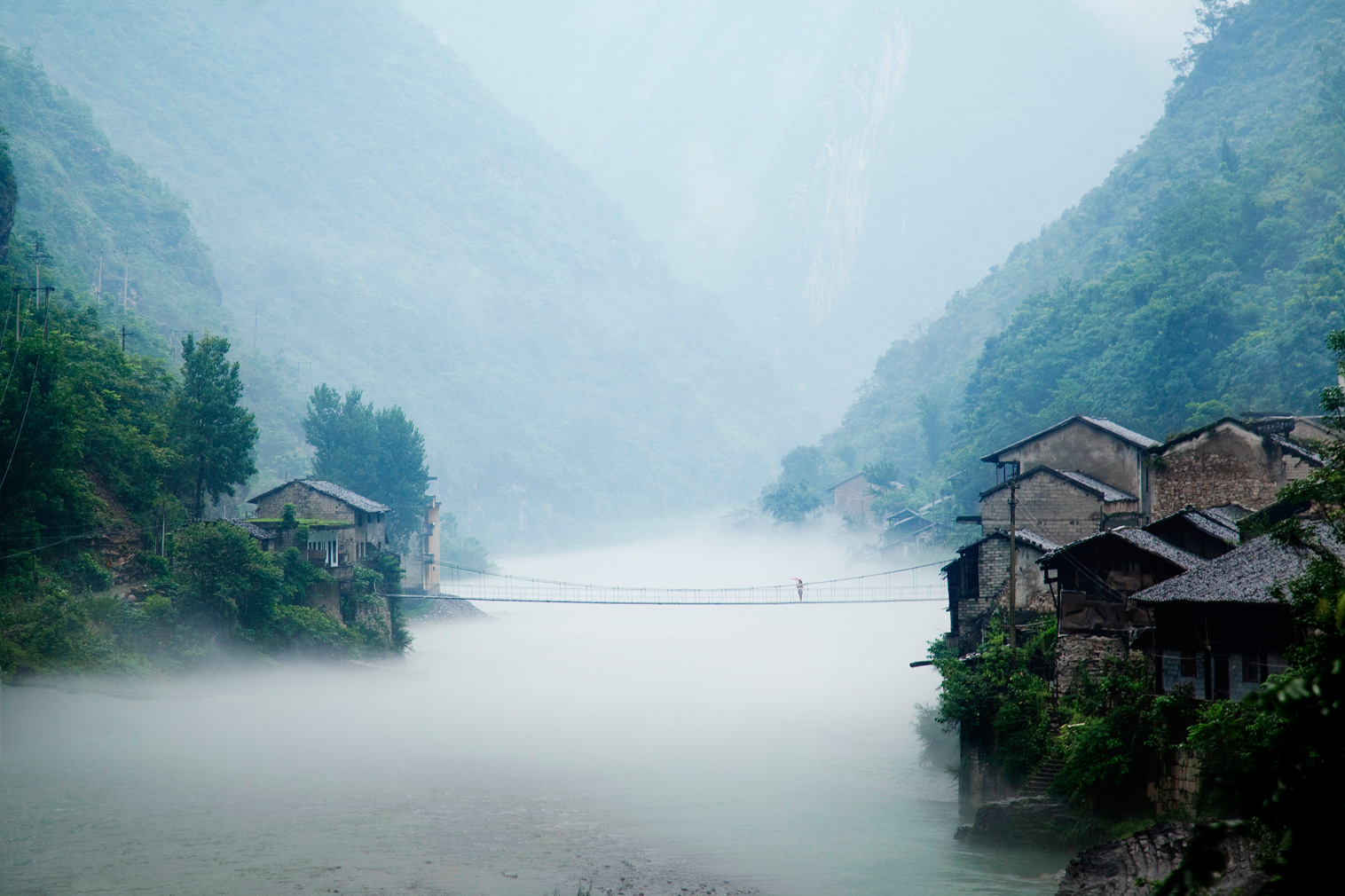1、首先,选图片的时候不能随便选择,要选比较空旷的,既是白色或者单色部分比较多的图,因为这样到最后才更有山水画的感觉。所以我就选了巫溪比较有特色的一张: