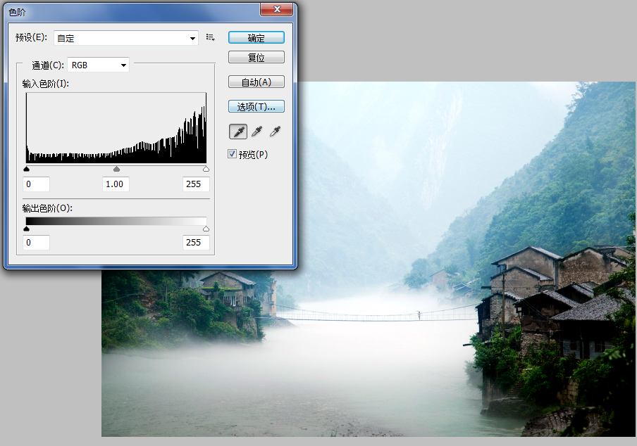 2、那么就开始有神器PS cs5来干了!首先让“色阶”改变画面的基调:将设置“白场”的吸管点击水面的中灰部分,这样,原本灰蒙蒙的画面就提亮了许多;再将设置“黑场”的吸管点击瓦面暗部 深灰的部分,于是反差大了,画面随之明快了起来。接下来,大幅度的减去了色饱和,这之前我抠下了桥的那个人和两边建筑部分色彩,为的是保留这部分的色彩,可以使画面活跃一些。