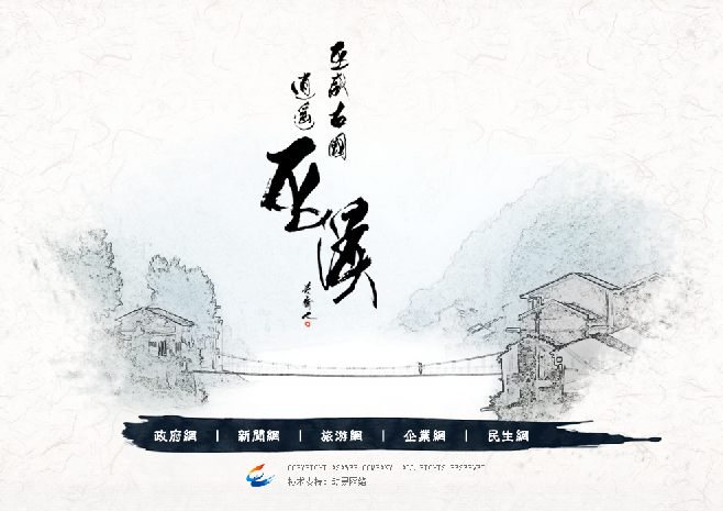 5、然后加上口号标语,然后把里面的巫溪二字放大用做标题,霸气外露!为了更让画面更飘逸和写意,用了毛笔工具只做了一个蒙版,配合文字用墨点制作了导航,是画面更加一致,更加漂亮。