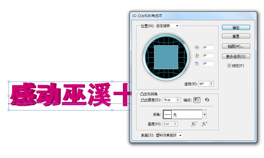 三、 选择效果菜单下的-3D-3D凸出和斜角,参数设置如下:
