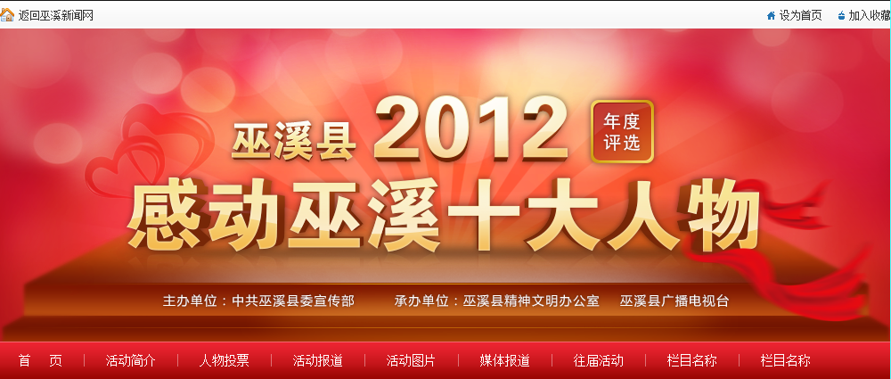 专题的头部设计一般是重点,我们了解专题的侧重点,是需要华丽的气氛吸引用户兴趣,还是提供内容给用户参与使用。下面我们来看巫溪感动十大人物的立体文字的设计:
