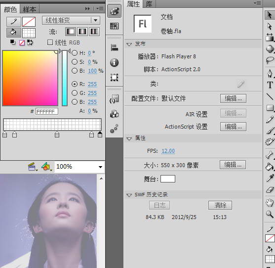 用矩形绘制一个矩形,宽(即为卷轴的宽度),高为舞台的高度(这里我的是400),位置X,Y为(0,0)。然后在第90帧插入关键帧,设置X,Y位置为(舞台宽度550,0)并设置形状补间。