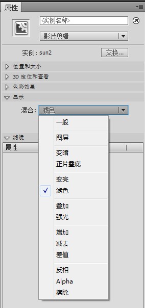 三、我们把做好的图片、光晕等导入Flash,导入Flash后,把光晕层转化为“影片剪辑”元件,然后选择混合模式为“滤色”,与Photoshop下效果是一样的。(