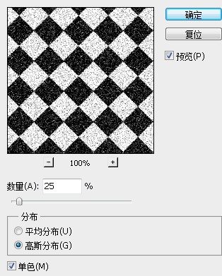 4、执行“滤镜→杂色→添加杂色“命令,设置数量为25%,如图所示: