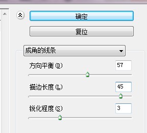 5、执行“滤镜→画笔描边→成角的线条“命令,在弹出的面板中设置参数,如图所示: