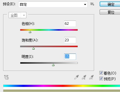 6、执行“图像→调整→色相/饱和度“命令,设置参数如下图所示,注意勾选”着色“选项,为竹编效果着色。